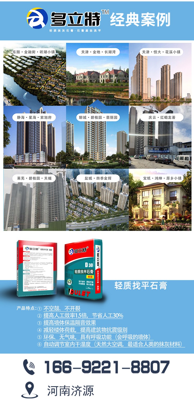 多立特天津廠區(qū)成立于2009年,公司于2012年開(kāi)始駐足于石膏產(chǎn)品的研發(fā),目前室內(nèi)石膏產(chǎn)品已相當(dāng)成熟及穩(wěn)定,公司于2019年成立多立特山東廠區(qū),以便發(fā)展壯大室內(nèi)石膏事業(yè)而努力,現(xiàn)為了開(kāi)拓南方市場(chǎng)特臨近原材料區(qū)成立濟(jì)源多立特新型建材有限公司。
